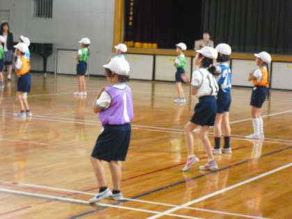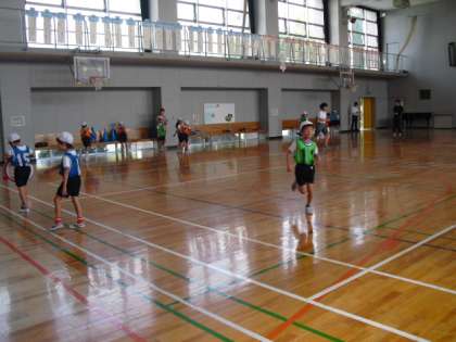 長縄跳びも4人のグループで工夫した跳び方にチャレンジしていました。子どもたちは忍者になったつもりで技を考え友達と意見交換しながら自然に体力を高めていくことにつなげていく、そんな遊び感覚の体力つくりが大事なのではないでしょうか。
