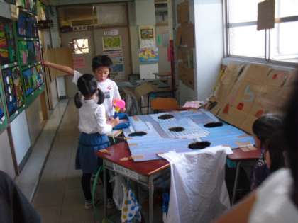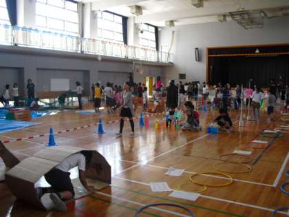 前半の学校の様子を見ていますと、大行列をしているお店にも根気よく並んでいる姿が見られ感心しました。また、体育館では思い切り体を動かし技にチャレンジしていました。廊下では、係りの子どもが、自分のお店に勧誘する姿が見られました。やる子どもも参加する子どもも、笑顔いっぱいです。