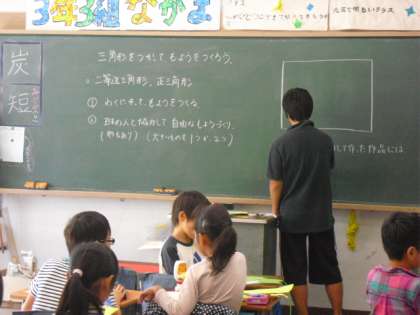 そのような中ですが教室では、学習に取り組む子どもたちの姿が見られます。3年生は3角形を組み合わせて形を作っていました。三角形の組み合わせからどんな形ができるのか確認しています。