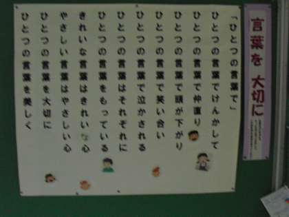 今週は美しい日本語週間です。昨日は、全校で群読をして、言葉の響きやリズムを味わいました。また、私の話では、「言葉」について再度考えてほしいことを話しました。そこで、「ひとつの言葉で」の詩を紹介しました。言葉のもつ重み、一つの言葉は人の気持ちをあたたかかくもしますが大きな見えない傷をおわせることもあります。ですから、「言葉」を発する時は、相手の気持ちを考えることが何より大事です。感情のままに言葉を発してはいけません。