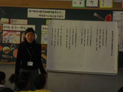昨日と、本日の2日間で2年生の全学級が勉強したことは、「バランスのよい食事」です。昨年度まで栄養士として本校で仕事をしていた割田栄養士が今週、教育実習に来ています。その実習の一端として、授業を行いました。