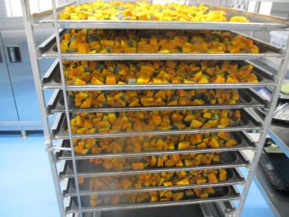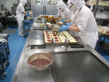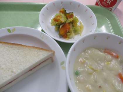 今日は「ジャムサンド」です。食パンに一枚一枚丁寧にジャムを塗って作っています。かぼちゃはサラダに入れるために、スチームオーブンで蒸しています。美味しくいただけるといいですね。