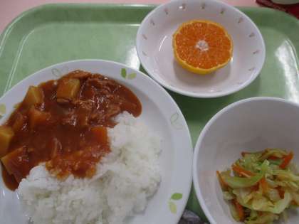 今日は「ハッシュドポークライス」です。豚肉・人参・玉葱・じゃがいもを使用しています。米粉でルーを作っています。美味しくいただけるといいですね。