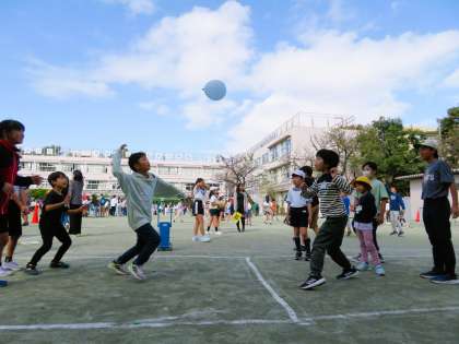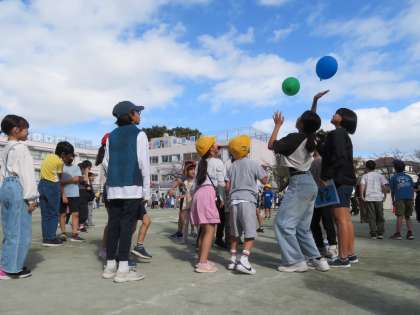 「風船バレー」で遊んでいる班の様子です!