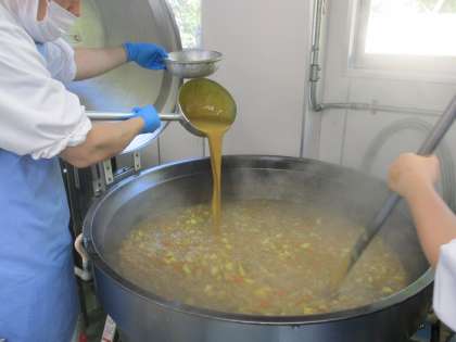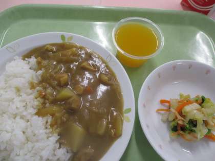 今日は「カレーライス」です。ベーコン・たまねぎ・じゃがいも・人参・鶏肉を使用して、米粉でルーを作っています。野菜も一緒に美味しくいただけるといいですね。