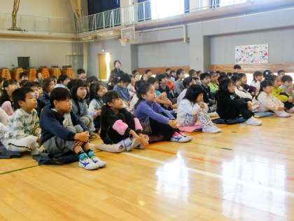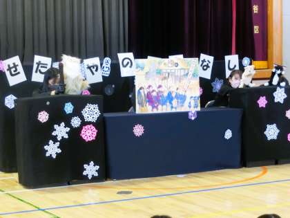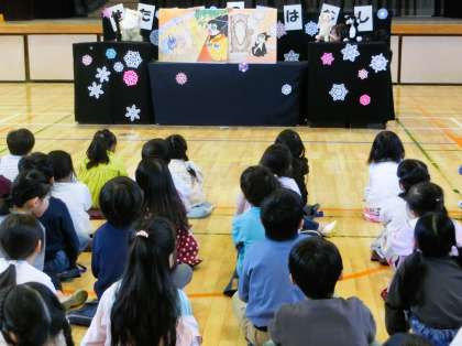 「民話の会」の方々が、1年生の子どもたちにお話し会をしてくださいました。民話の会は、学校運営委員会のプロジェクトの一つの活動です。メンバーの皆さんが、お話を作ったり絵を描いたりして、自分たちで制作した手作りの大型紙芝居でのお話会です。「チャチャ」と「マンマル」という案内役の猫に導かれ、お話の世界に入っていきました。