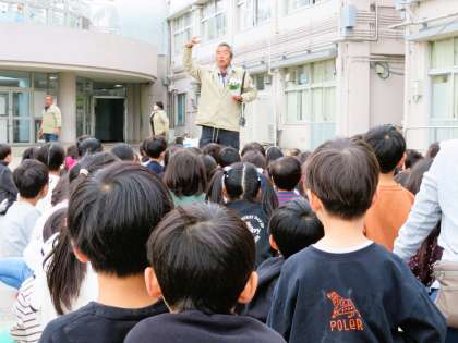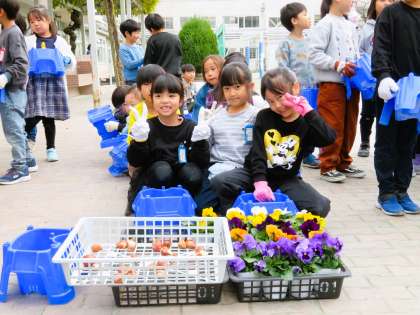 1年生はチューリップの球根とパンジーの苗を植えました。ゲストティーチャーのお話に、静かに傾聴することができました。