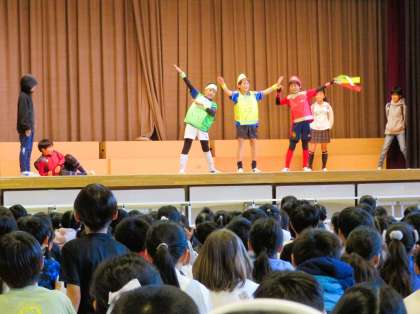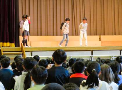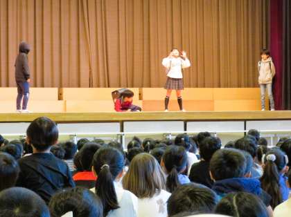 給食委員会は、寸劇やクイズを交えて、朝ごはんの大切さや栄養バランスの大切さについてわかりやすく発表しました。