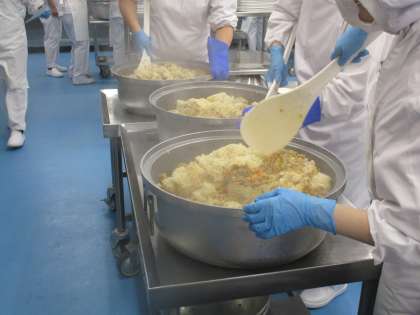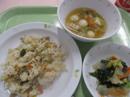 今日は「じゃこいりチャーハン」です。じゃこはカルシウムがたくさん含まれています。チャーハンに入れて、ほかの野菜と一緒に食べると食べやすいですね。美味しくいただけるといいですね。