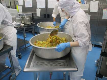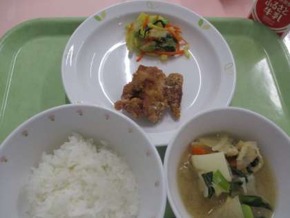 今日は「とりにくのから揚げ」です。もも肉という部位を使用して作っています。お味噌汁・サラダに野菜を豊富に使用しています。美味しくいただけるといいですね。
