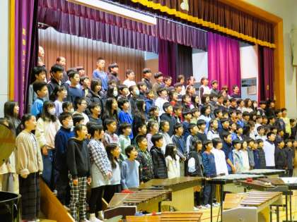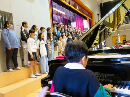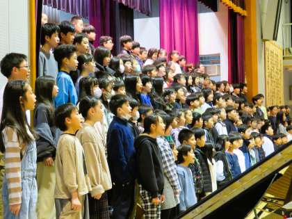 合唱曲「MUSIC」は、NHK合唱コンクールの課題曲で、私の大好きな曲です。自分を奮い起たせるとってもいい歌です。5年生、よくがんばりましたね!