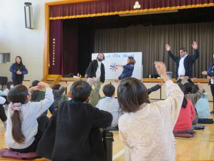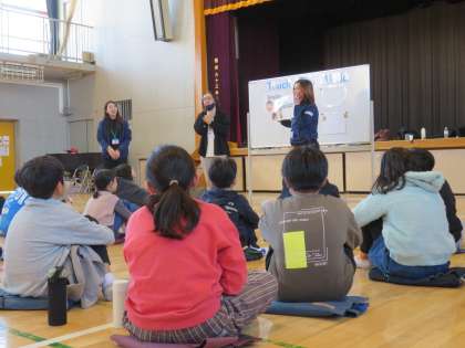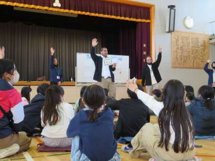 はじめに、ALTの先生の自己紹介がありました。子どもたちはこのイベントをとても楽しみにしていたようで、出身国や好きなものを話すと、元気に反応していました。