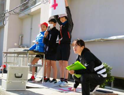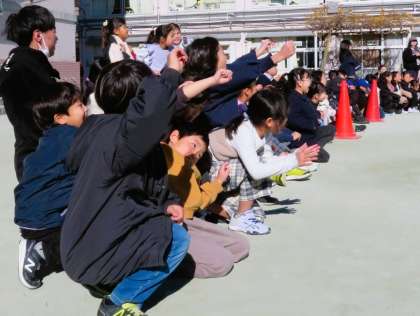 2年生の応援の様子です。6年生の実行委委員さんは、周回や実況放送を行い大会を盛り上げています!