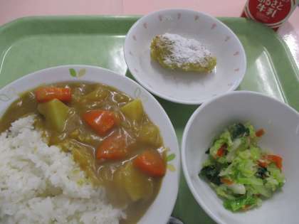 今日は「チキンカレーライス」です。にんにく・しょうが・じゃがいも・玉葱・人参・鶏肉を使用して作っています。1・2・3年生は少し甘く、4・5・6年生は少し大人の味になっています。スイートポテトはさつま芋をボイルし、潰して、成型し焼いています。美味しくいただけるといいですね。