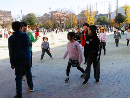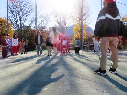 「長縄跳び」「だるまさんがころんだ」で、遊んでいる様子です。