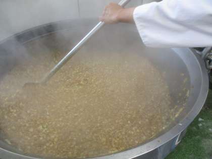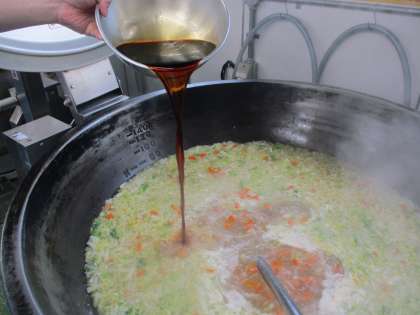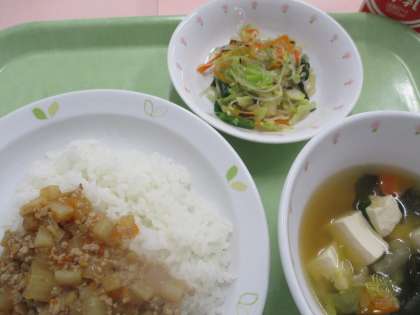 今日は「ジャージャー丼」です。にんにく・しょうが・大根・玉葱・人参・椎茸・筍・豚ひき肉を使用して作っています。美味しくいただけるといいですね。
