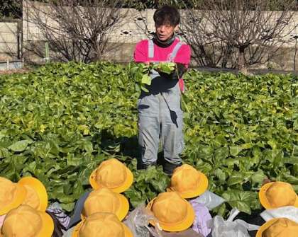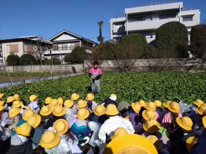 1年生が近くの秋山農園で小松菜採りをしてきました。子どもたちは、農園での説明をしっかりと聞き、城南小松菜『まぼろしの小松菜』の香りやさわり心地を楽しみながら収穫をして来ました。