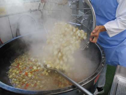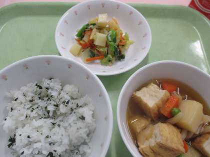 今日は「じゃが芋のうま煮」です。たまねぎ・人参・じゃがいも・こんにゃく・生揚げを使用して作っています。食べやすい味付けです、美味しくいただけるといいですね。