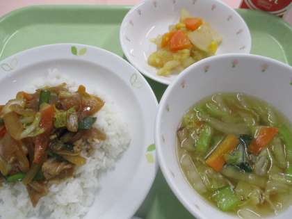 今日は「プルコギ丼」です。玉葱・人参・白菜・しょうが・にんにく・調味料で作っています。八丁味噌で味を整えています、美味しくいただけるといいですね。