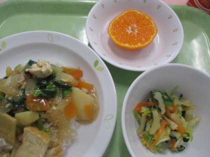 今日は「家常豆腐丼」です。中国料理の一つです。「家」・「常」・「豆腐」家庭に常にある食材という意味があるそうですね。美味しくいただけるといいですね。