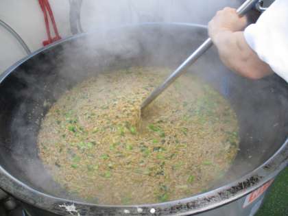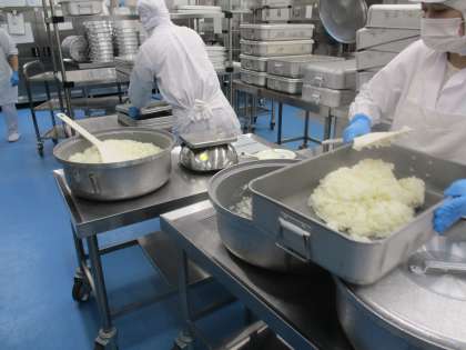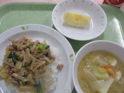 今日は「二色丼」です。白菜・小松菜・コーン・こんにゃく・鶏ひき肉を使用して作っています。白いごはんの上にかけていただくので、しっかりとした味付けになっています。美味しくいただけるといいですね。