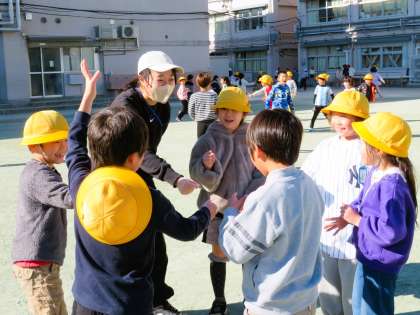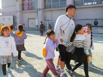 松丘小学校は、朝遊びの時間や休み時間に、校庭いっぱいに広がって遊ぶ子どもたちの笑顔ではちきれそうです。中でも、子どもたちと一緒に先生たちも遊んでいると、いっそう笑顔が膨らみます!