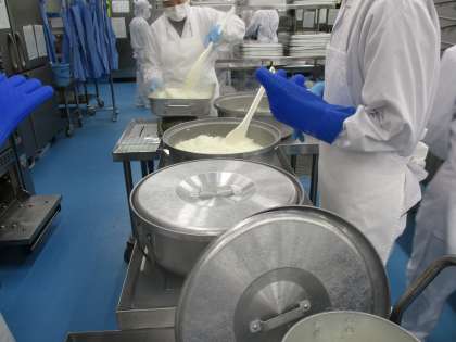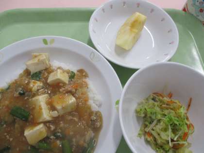 今日は「麻婆豆腐丼」です。にんにく・しょうが・玉葱・人参・ねぎ・しいたけ・たけのこ・にら・豚ひき肉・豆腐を使用して作っています。美味しくいただけるといいですね。