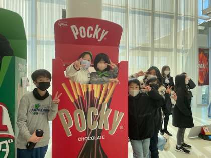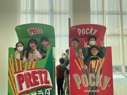 いよいよポッキーストリート(工場見学)です。ポッキーの仕上げ・包装までの製造工程がガラス越しに見学できます。見学を終えると、ポッキーがさらに身近に感じられました。工場内は撮影禁止です。