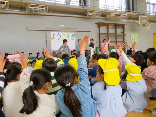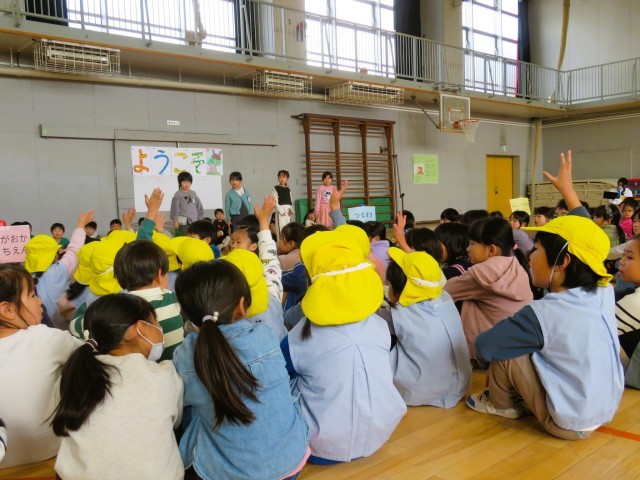 今日は、本校の1年生と松丘幼稚園、弦巻保育園、西弦巻保育園、東弦巻保育園の年長さんとの交流会がありました。小学校の生活を知ってもらおうということで、体育館交流、授業体験、学校探検を行いました。