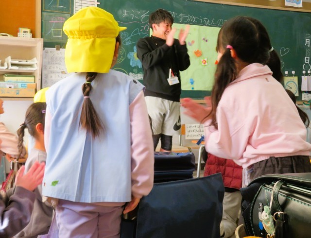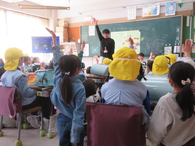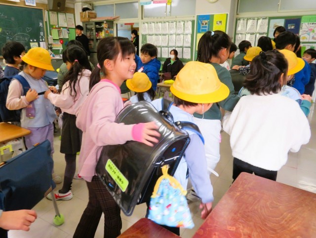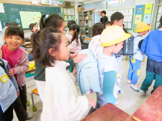 小学校の黄色い安全帽子やランドセルを背負う体験ができました。先生の話を聞く体験もしましたが、話を聞く姿勢がとっても立派です。