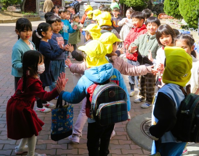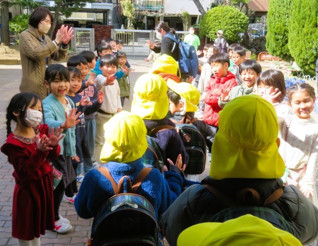 幼稚園や保育園に帰っていく皆さんに、花道を作って拍手でお見送りをしました。姿が見えなくなるまで手を振っている1年生の姿がありました。
