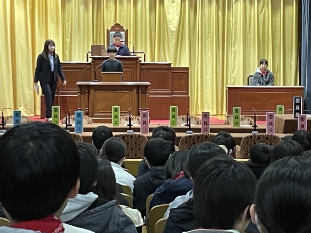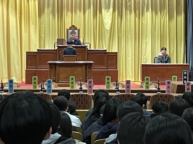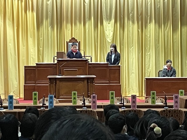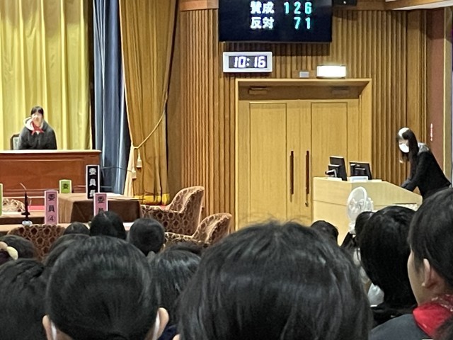 模擬本会議を開催しました。議長が進行役を務め、委員長から委員会での話合いの内容と結論を報告してもらいます。議員全員が押しボタン式投票に参加し、法律を成立させました。