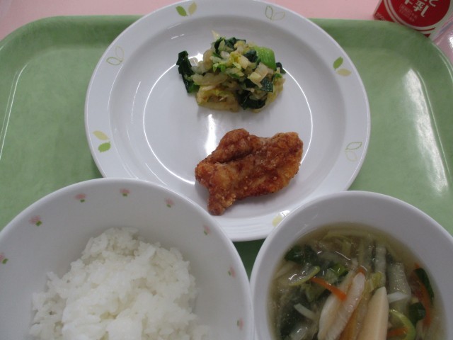 今日は「小松菜と白菜の和え物」です。小松菜には疲労回復や免疫力を高める力が含まれています。骨や歯の健康にも役立ちます。鶏肉のから揚げと一緒に美味しくいただけるといいですね。