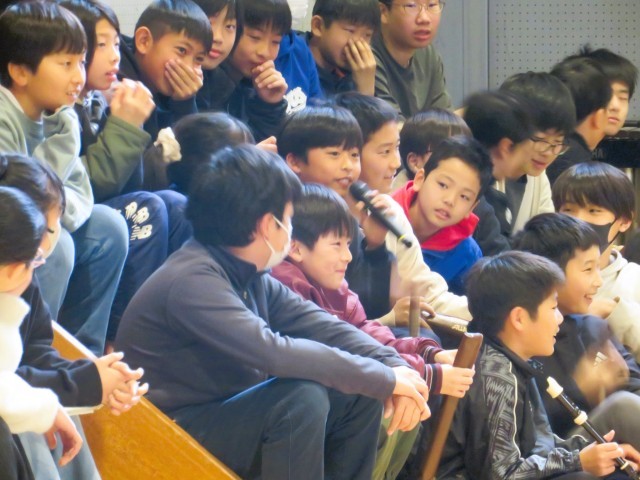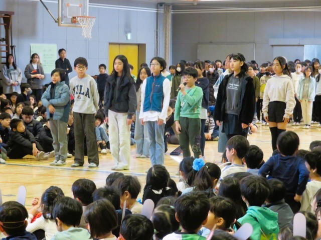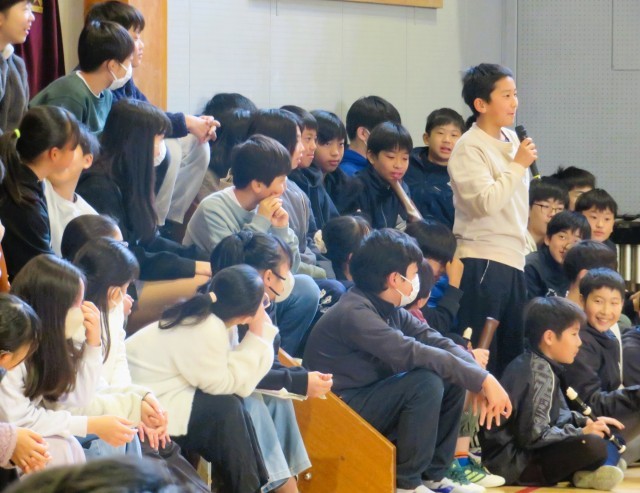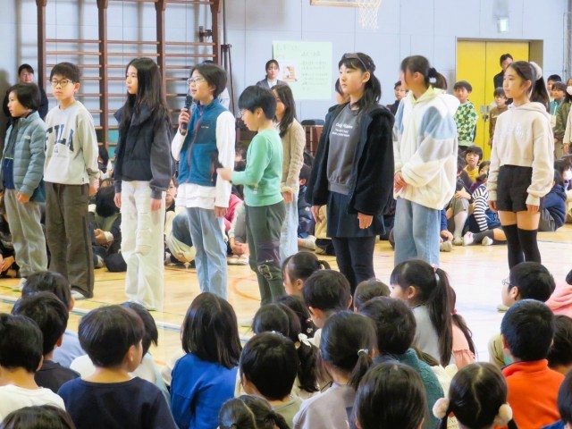 5年生は「6年生へのインタビュー」です。6年間を振り返ってもらうことと、最高学年としての心構えをインタビューで答えてもらいました。最後に感謝を伝えて締めくくりました。