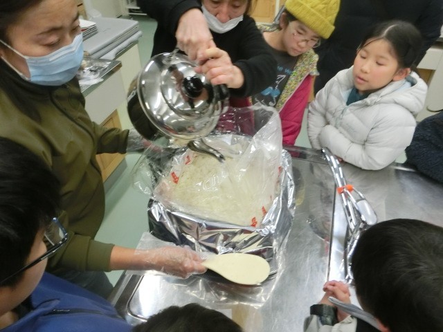 アルファ米の調理では、上手に炊くコツを教えてもらいました。