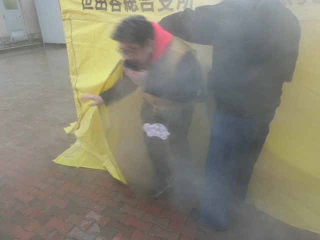 煙体験では、大人も一緒に煙の部屋の中に入って体験しました。