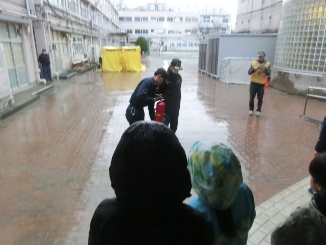 消火器訓練で、消防士の方から消火器の使い方を教わりました。