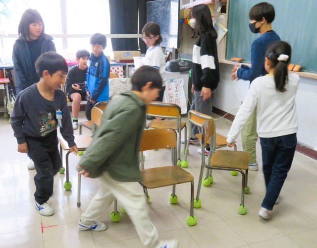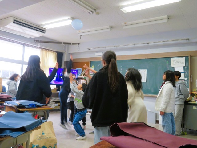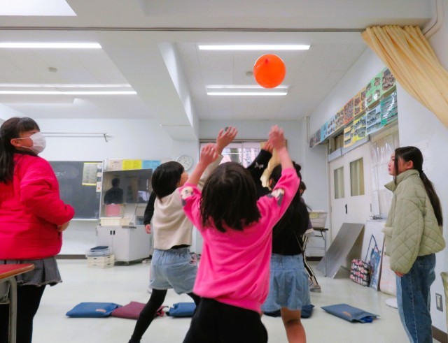 「椅子取りゲーム」や「風船バレー」で遊んでいる様子です。