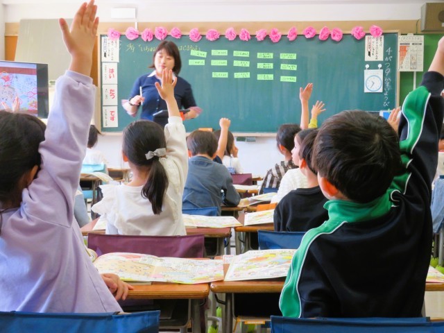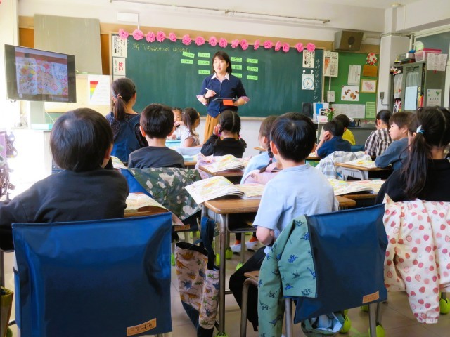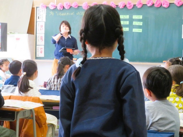 私は1年生の教室をはじめ、すべての教室をまわっています。姿勢正しく先生の話を聞いている子どもたちに感激です。松丘小学校の1年生は、みんな勉強が大好きな子どもたちに見えました。