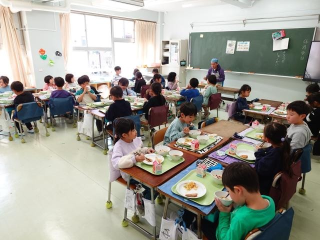今日は、入学・進級祝いの赤飯です。給食当番が一生けんめい配膳した給食を、おいしそうに食べていました。