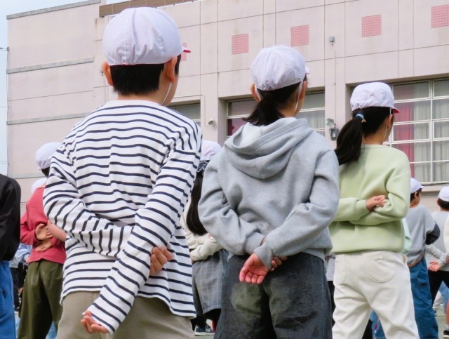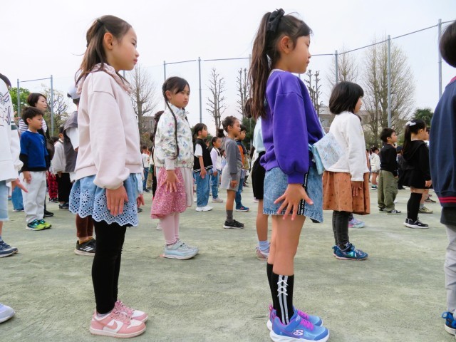 今日の体育朝会は集団行動です。集団で行動する際の「きまり」や「約束」について、一つ一つ確認をしながら練習をしました。「気をつけ」や「休め」の姿勢、「前へならえ」「体育座り」など、きびきびと集中して練習に取り組みました。