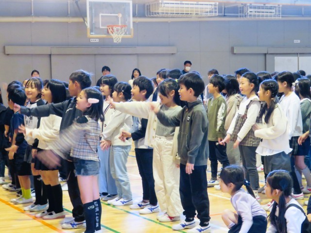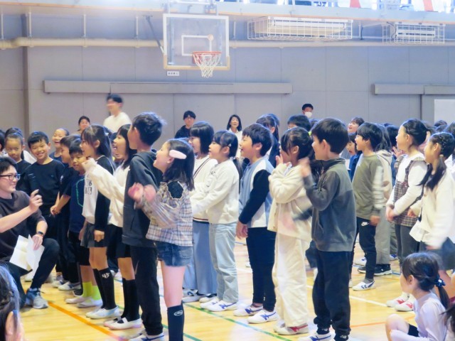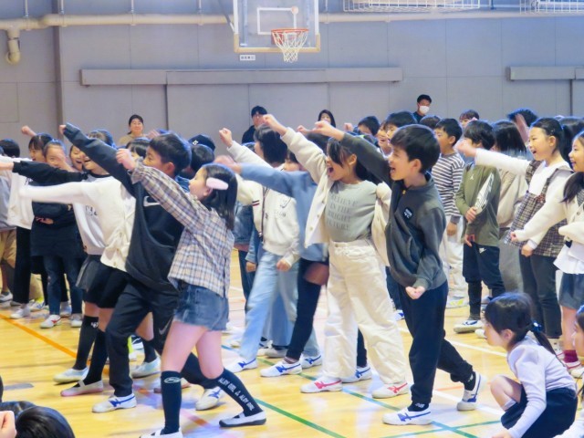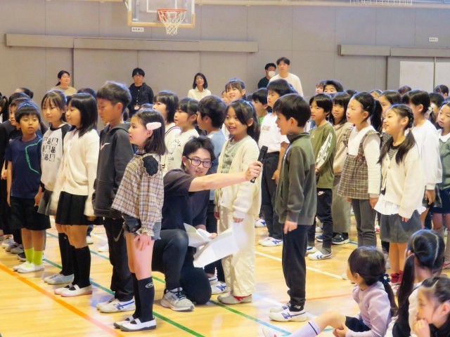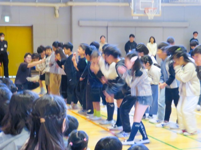 写真は、1年生へメッセージを伝えている3年生の様子です。