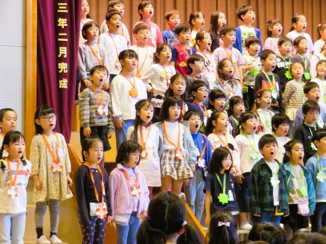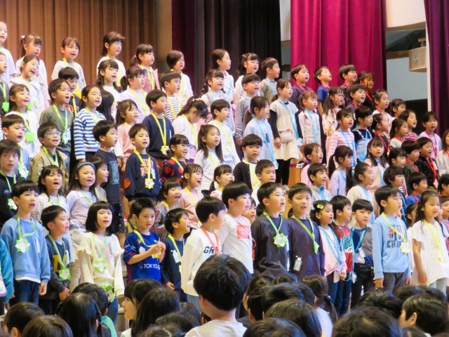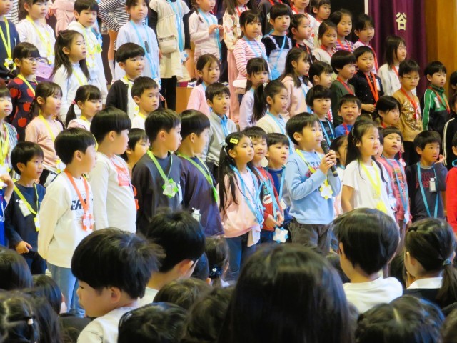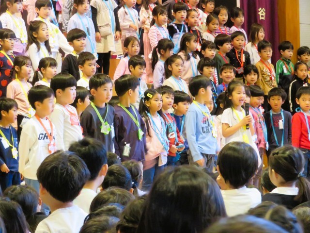 今度は1年生の出番です。お礼の気持ちを込めた代表児童の言葉、そして1年生全員で歌「勇気100%」を元気いっぱいに歌いあげました。