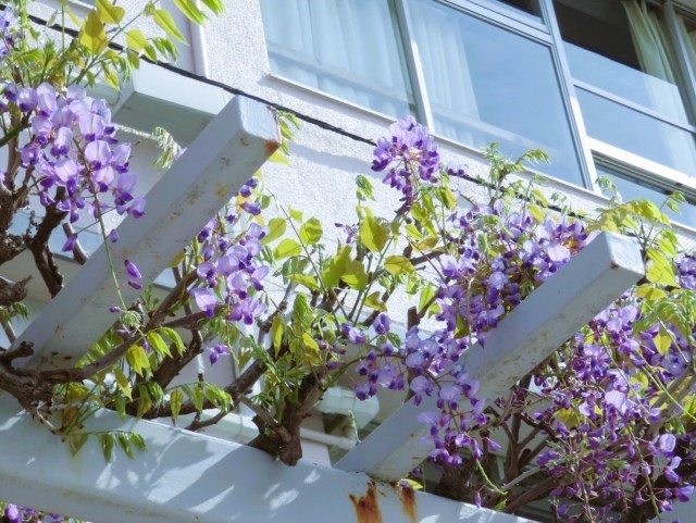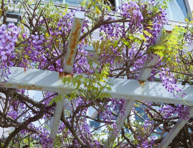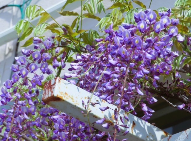 写真は、校長室前の藤棚です。藤の花が美しく咲いています!