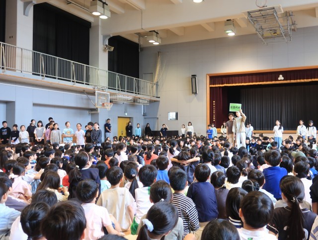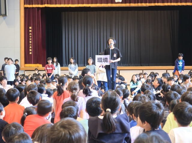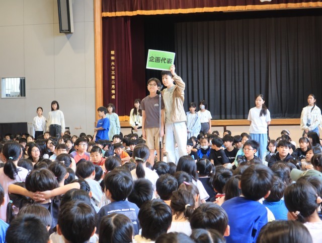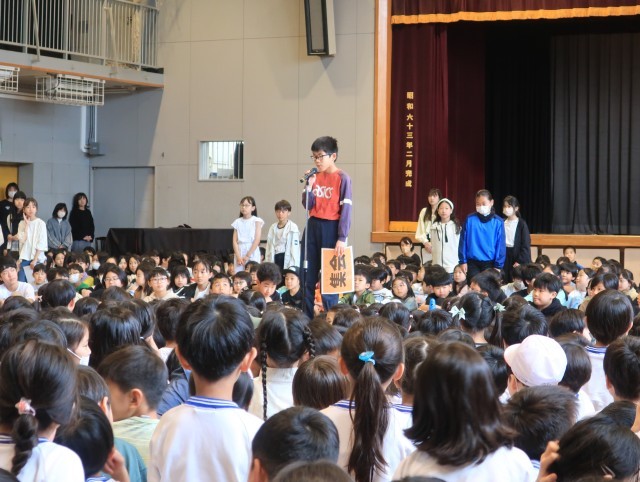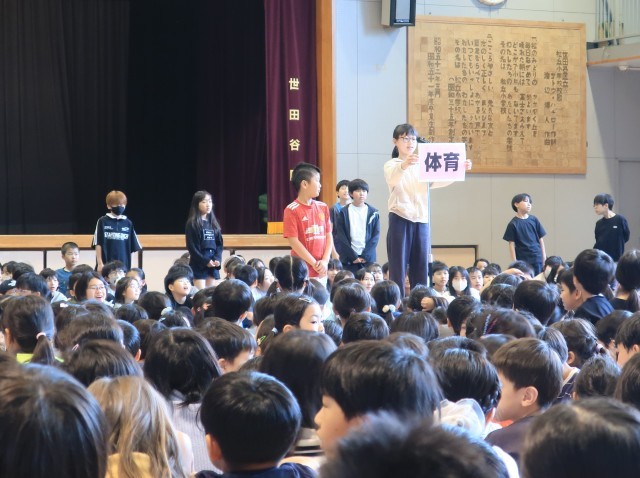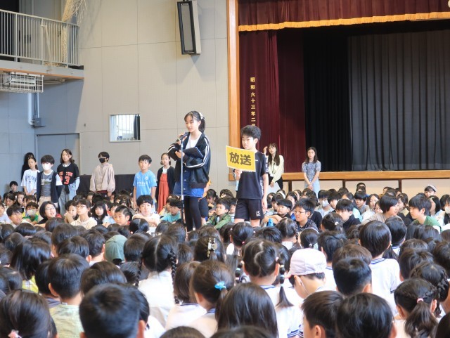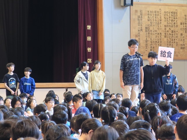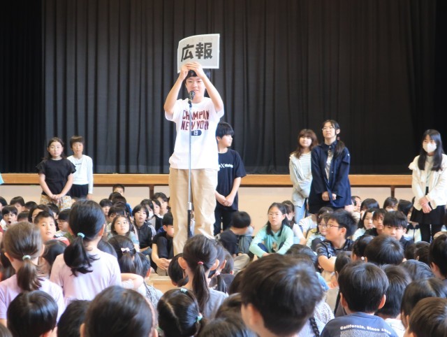 今日の集会では、それぞれの委員会の活動を全校児童に向けて発表しました。