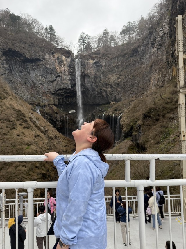 最後に、日本三名瀑の一つ、華厳の滝です。エレベーターで下りて正面から滝壷付近を眺めて来ました。水しぶきを上げながら、轟音とともに流れ落ちる滝の姿は豪快そのものです。水分補給もバッチリ!