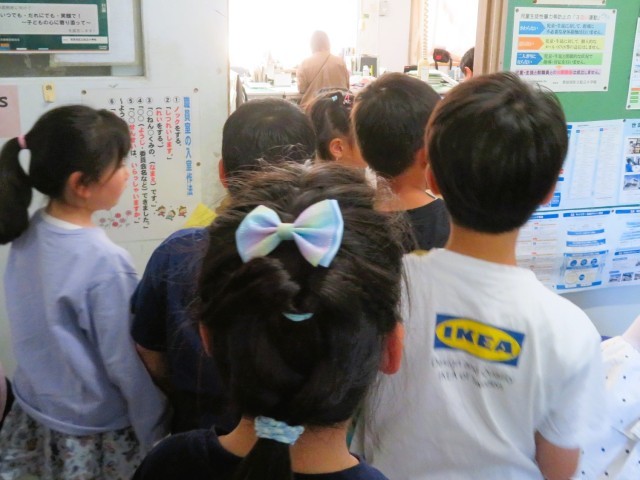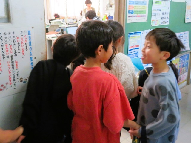 1年生をやさしくリードしながら、校長室、職員室、主事室、体育館、図書室、展望廊下など、それぞれの場所に案内しました。