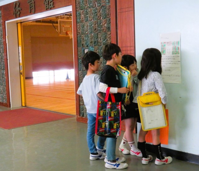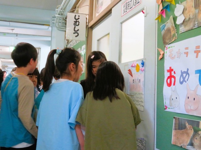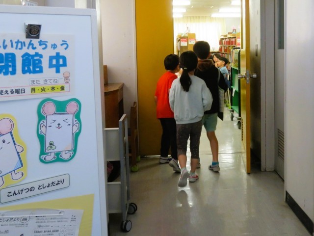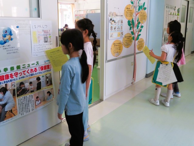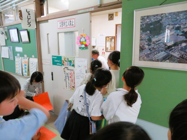 主事室、保健室、事務室、体育館、図書室に案内をしている様子です。