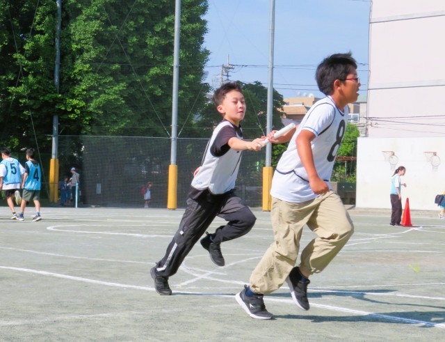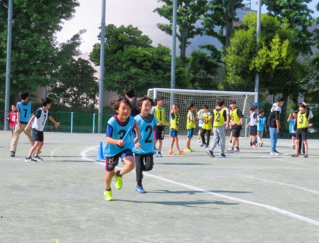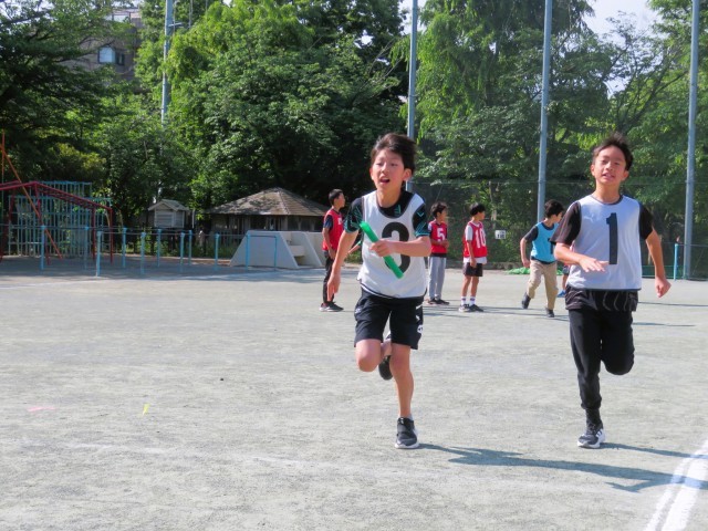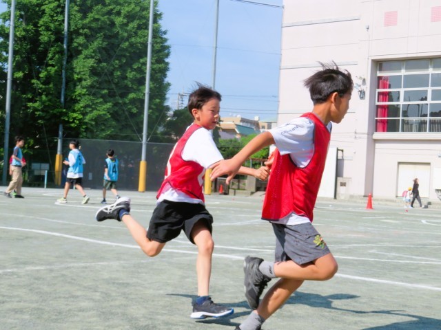 先生のお手本を見ながら、バトンを右手で持って走り、左手でもらう練習を何度も繰り返していました。