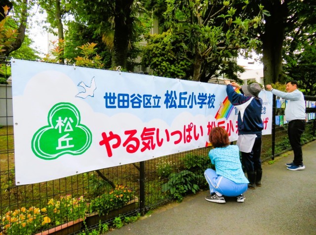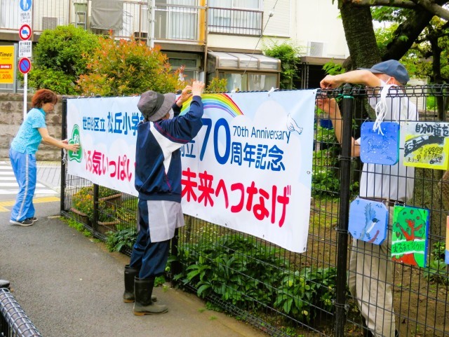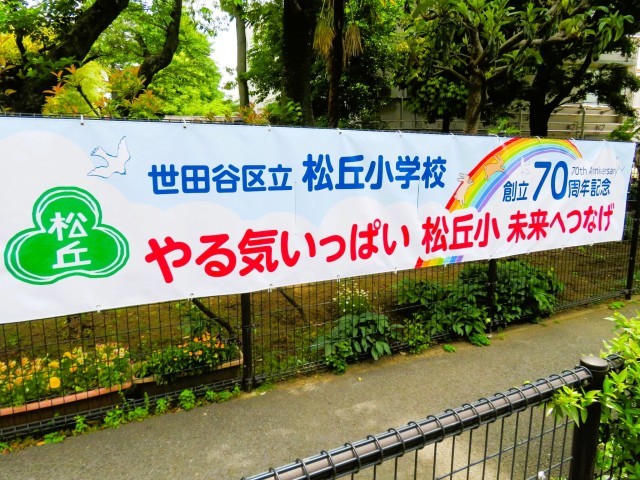今年度は、松丘小学校創立70周年を迎えます。記念にいただいた横断幕を張りました。デザインは子どもたちから募集したものです。人気者のウサギ「モカ」と「ラテ」もいます!